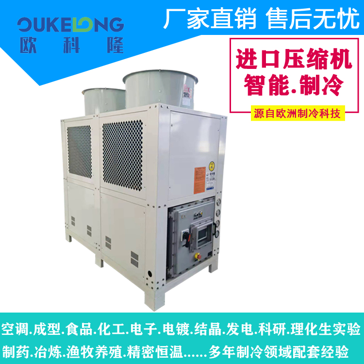 風冷箱式防爆冷水機,是歐科隆制冷打開市場的拳頭產品,歐科隆制冷擁有廣泛的防爆冷水機配套經營,包括臭氧發生器,甲烷發電,化工化纖,石油天然氣,新型環保行業等,歐科隆防爆冷水機采用隔爆、增安、本安、正壓、充油、充砂、無火花、澆封和氣密等多種防爆方式,使機組可以在易燃易爆場合使用。