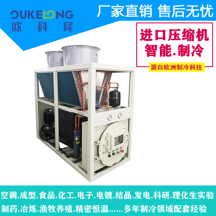 風冷箱式防爆冷水機,是歐科隆制冷打開市場的拳頭產品,歐科隆制冷擁有廣泛的防爆冷水機配套經營,包括臭氧發生器,甲烷發電,化工化纖,石油天然氣,新型環保行業等,歐科隆防爆冷水機采用隔爆、增安、本安、正壓、充油、充砂、無火花、澆封和氣密等多種防爆方式,使機組可以在易燃易爆場合使用。