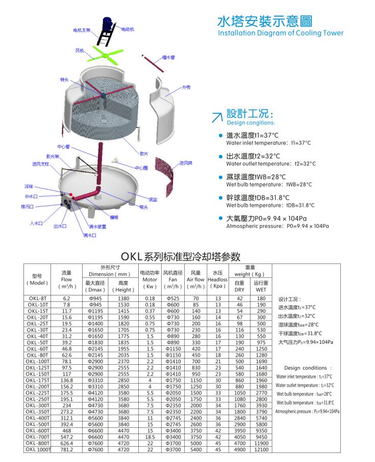 歐科隆圓形逆流式冷卻塔有三大系列、九種型號、九十個產品.